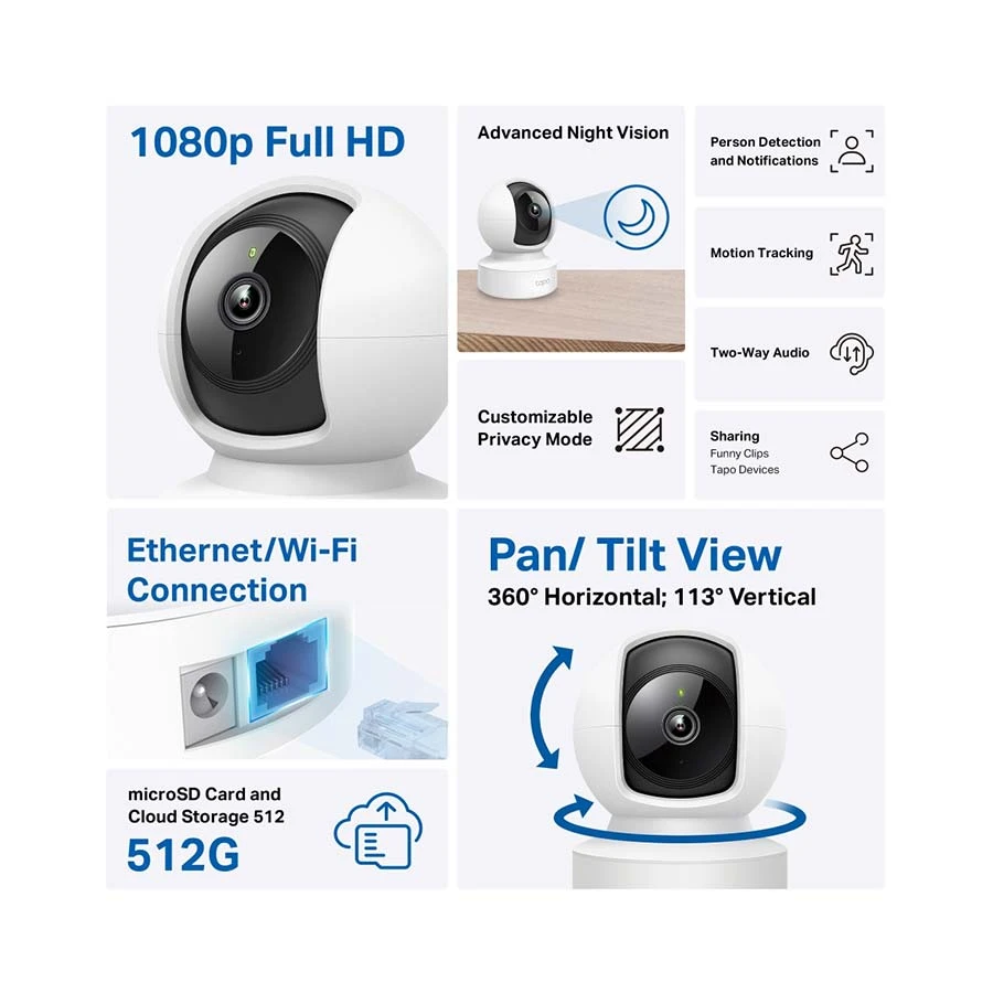 High-Definition Video: Records every image in crystal-clear view, Pan and Tilt: 360 degree horizontal and 113 degree vertical range, Advanced Night Vision: Provides a visual distance of up to 40 ft, Motion Detection and Notifications: Notifies you when the camera detects movement, Sound and Light Alarm: Trigger light and sound effects to frighten away unwanted visitors. Two-Way Audio: Enables communication through a built-in microphone and speaker, Person Detection and Notifications, Flexible Storage Choices, Precise Motion Trackin, Tapo Sharing, Advanced Night Vision