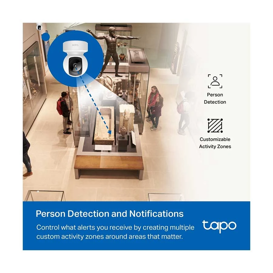 Aperture: F2.4, Siren Volume: 90dB (Level measured at 4-inch/10-cm distance), Cloud Storage: Tapo Care Cloud Storage Services (Subscription required), AI Detection: Motion Detection, Person Detection, Baby Crying Detection, Activity Zones : Yes, Google Assistant, Amazon Alexa, Mounting Options : Tabletop, Ceiling-Mounted, Package content: Tapo Pan/Tilt Home Security Wi-Fi Camera, Power Adapter, Quick Start Guide, Mounting Screws, Mounting Plate, Camera Base